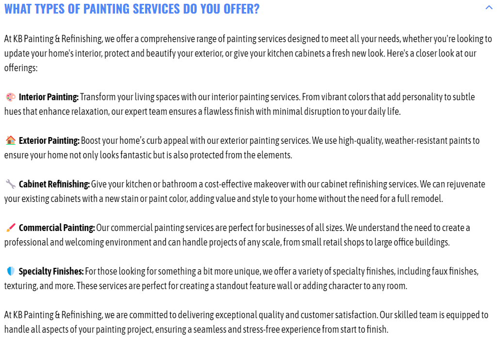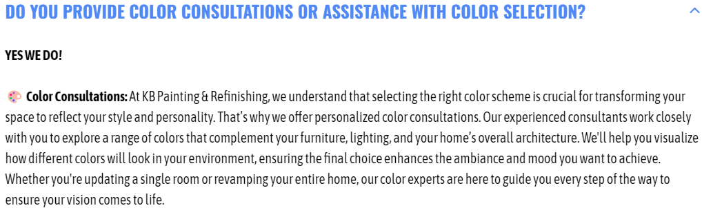 The client must review and approve all selected colors in advance. KB Painting & Refinishing LLC is not responsible for dissatisfaction with color choices after the paint has been applied. Color samples can be provided upon request, but additional charges may apply for sample application or changes made after approval. We will add your selected colors into our system. This color cannot be changed after application without doing the project over again.